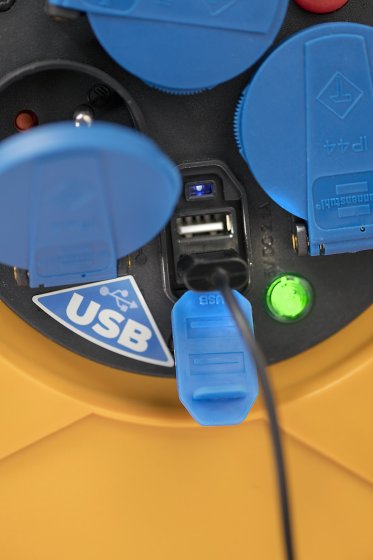 Enrouleur de câble Standard PRO USB / Enrouleur électrique (3 prises avec clapets, 2 ports USB 5V/2,1A, voyant de tension, poignée, frein, clip, 40m H07RN-F 3G2,5, en extérieur), fabriqué en France