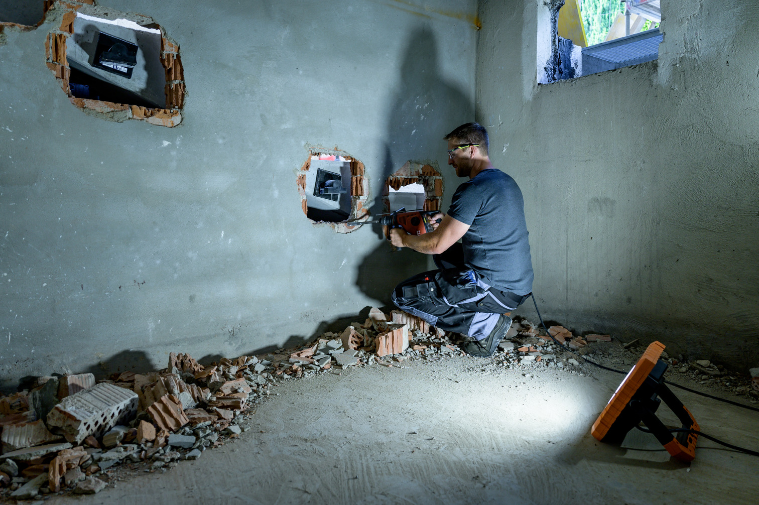 Le projecteur LED X 12051 M FR est une lampe de chantier LED extrêmement robuste d'une puissance de 115W env. qui répond aux exigences les plus élevées. Grâce à son indice de protection IP54 et aux 5m de câble RN-F résistant aux hydrocarbures, le projecteur de chantier est idéal pour une utilisation professionnelle en intérieur et en extérieur. Le projecteur peut être commuté par le biais d'un interrupteur marche/arrêt et est équipé de la fonction de variation de l'intensité lumineuse en continu (appui long sur l'interrupteur). De plus, la prise de courant intégrée au projecteur est dotée d'une protection contre la poussière et les projections d'eau par le biais du clapet à fermeture automatique et permet le branchement d'un autre appareil sans aucune modification de l'éclairage. Le phare de travail LED possède une puissance lumineuse de 12700lm et dispose d'une poignée intégrée. Découvrez ci-dessous les caractéristiques détaillées du produit :